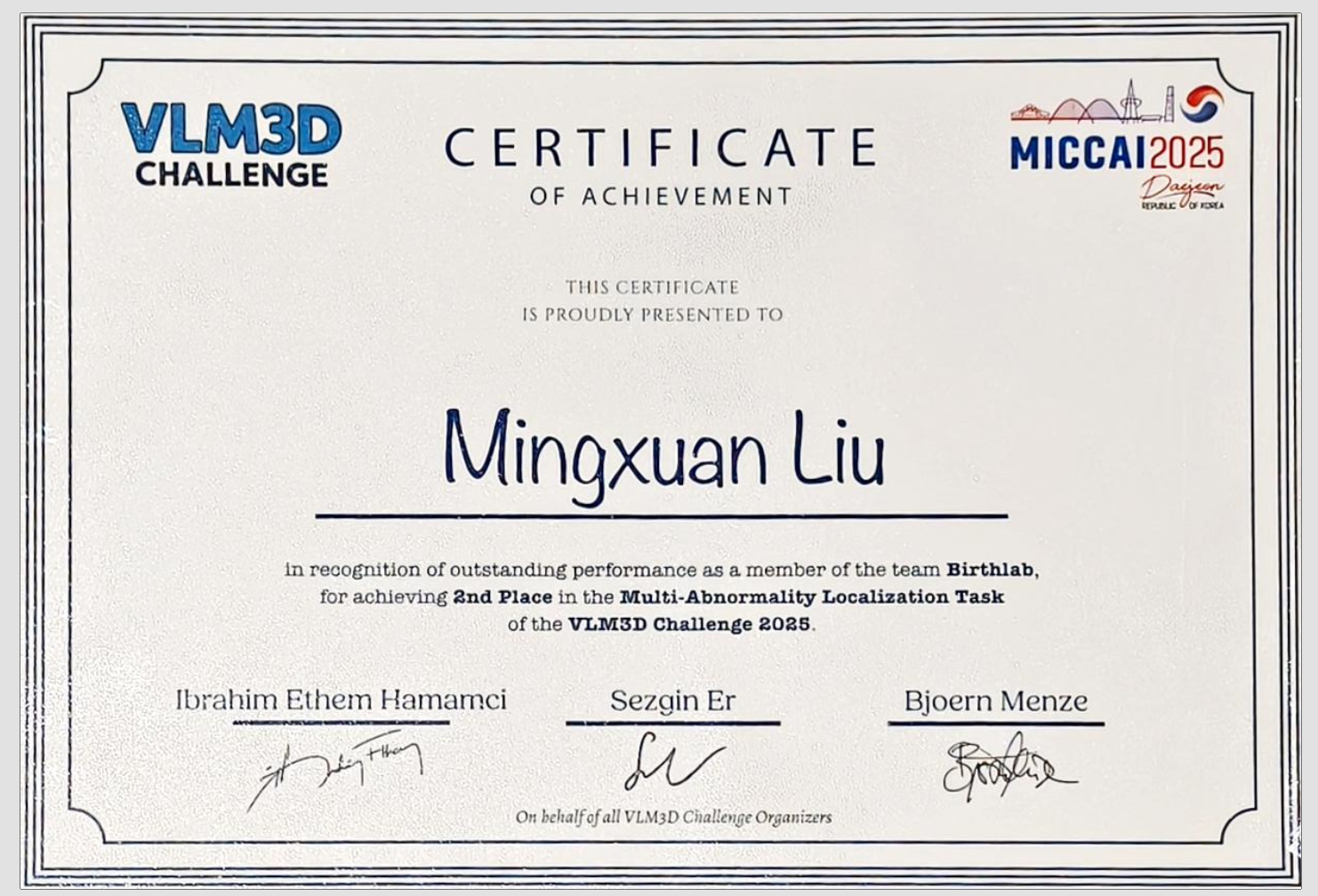 - [Certificate] 2025 MICCAI VLM3D Challenge 2nd Place Winner