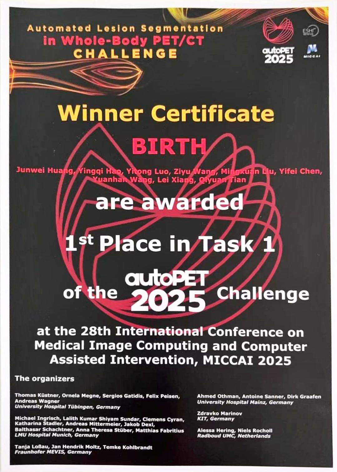 Top scholarship in China. 0.2% domestically. - [Certificate] 2025 MICCAI autoPET IV Challenge 1st Place Winner