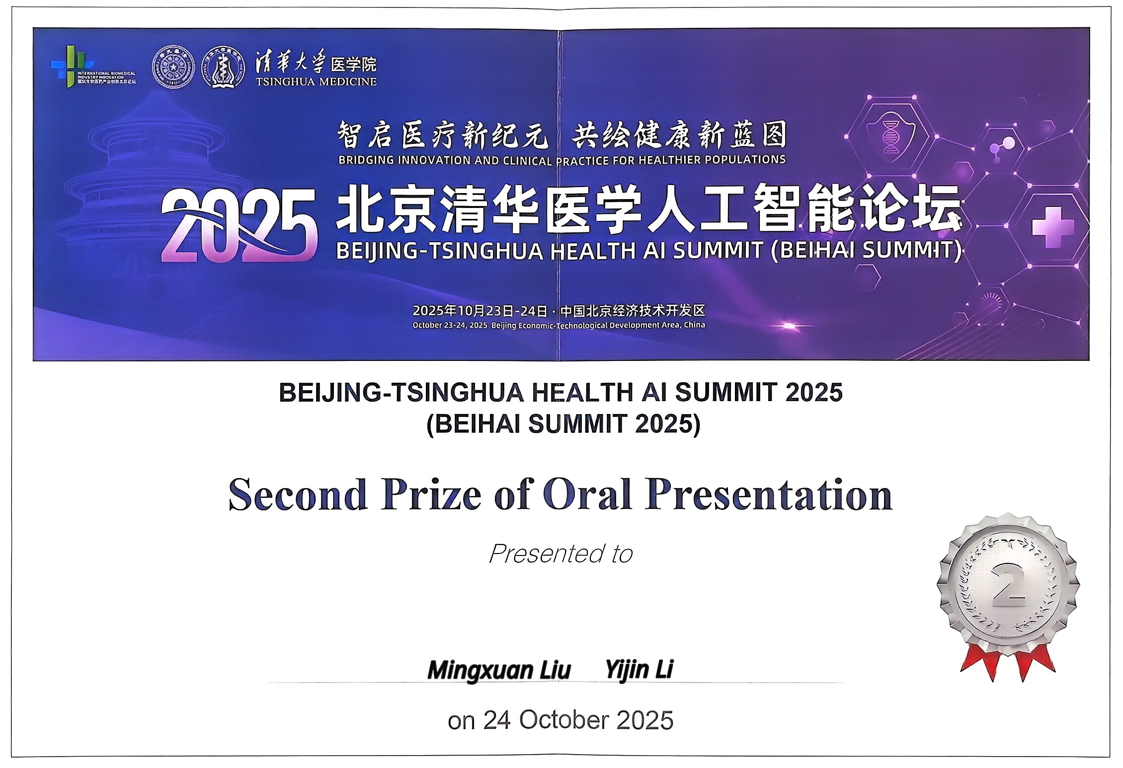2025.10.24: 🎉🎉 Awarded BEIJING-TSINGHUA HEALTH AI SUMMIT 2025 (BEIHAI SUMMIT 2025) Second Prize of Oral Presentation.